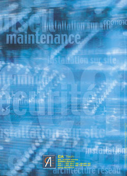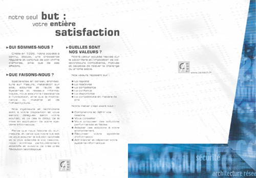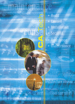 CATECH est une entrprise d'Audit, de Conseil, de Sécurité, d'Assitance et de Mainteanance dans le domaine informatique. Il fallait donc que l'apparteance à ce secteur saute au yeux. D'où le choix typographique, la dimension humaine et technique des photographies de banque d'images (peu de moyen, petite entreprise...), et le fond photoshop avec une superposition de textes, d'images et d'effets très à la mode à l'époque de ce travail.