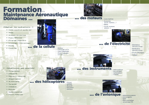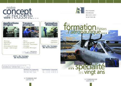 Le service communication pour lequel notre maquettiste à travaillé un certain temps à réalisé, entre autre chose, plusieurs plaquettes 4 pages pour des formations spécifiques à l'entreprise et diplômantes, aux métiers de l'aéronautiques.