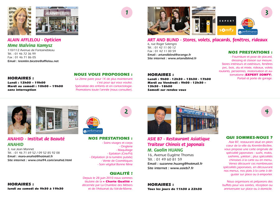 Il fallut faire un énorme travail en amont, pas par mes soins afin de récolter toutes les informations concernant chaque commerçant : noms, coordonnés, horaires, texte de présentation, choix de l'activité, et aussi la promo qu'ils étaient prêt à faire pour leur chèque.